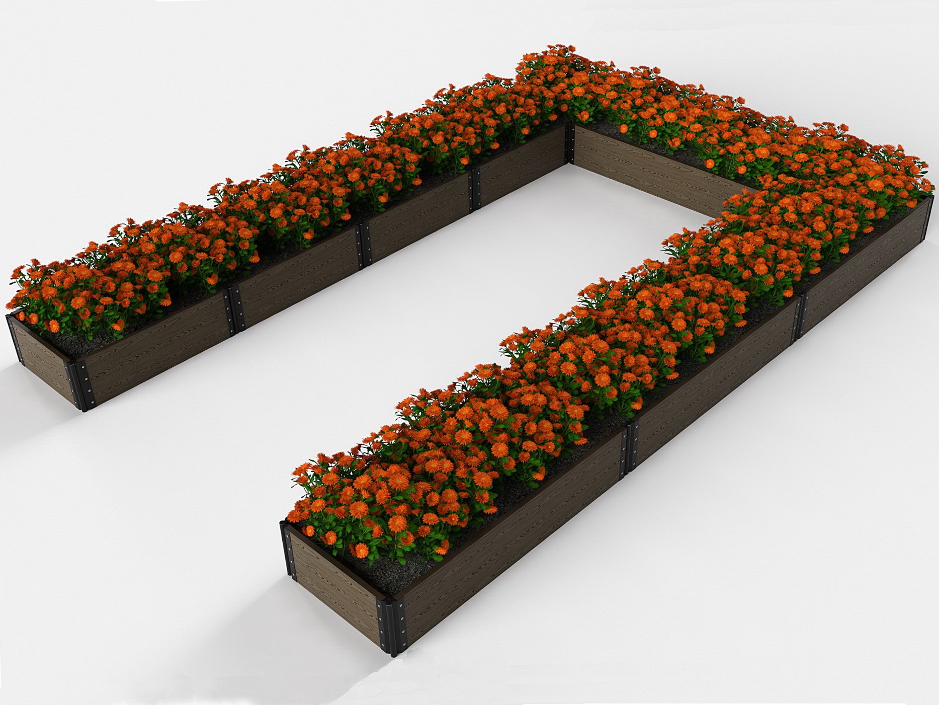 Именно такими являются высокие клумбы и цветники из ДПК с поворотными фрагментами для возможности создания разнообразных фигур. Например, представленные в фотографиях изделия позволяют создать одноярусные клумбы треугольной, прямоугольной формы и в виде звезды, буквы «П» и других символов.
