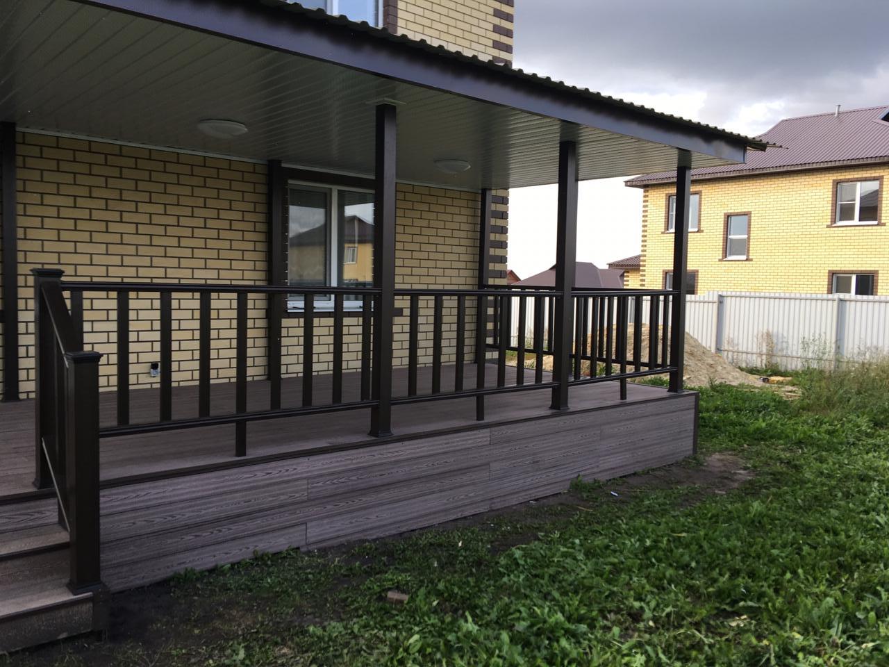 Ограждения и перила лесенки также марки Holzhof. Особенностью монтажа ограждений из ДПК Holzhof стало то, что трехметровый профиль был надет на металлические столбы-опоры прямо до потолка крыши, что придало всем ограждениям единый стиль цвета венге и органично вписалось в архитектуру дома.