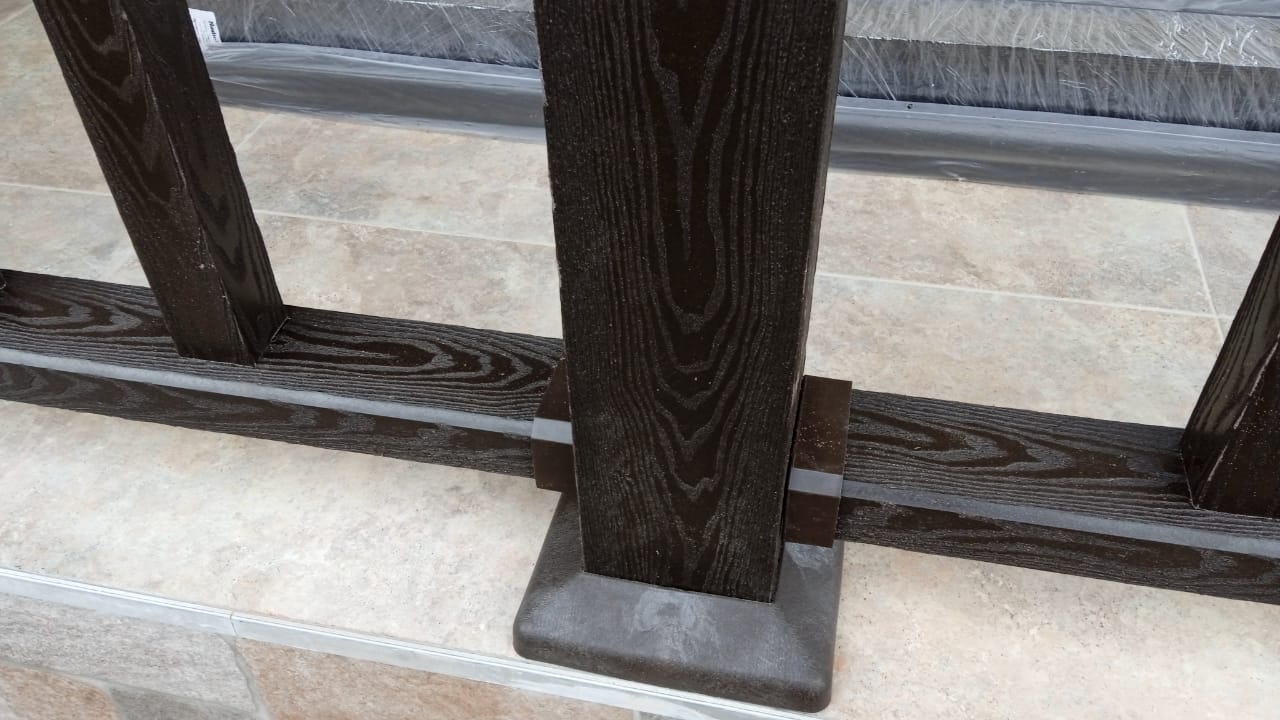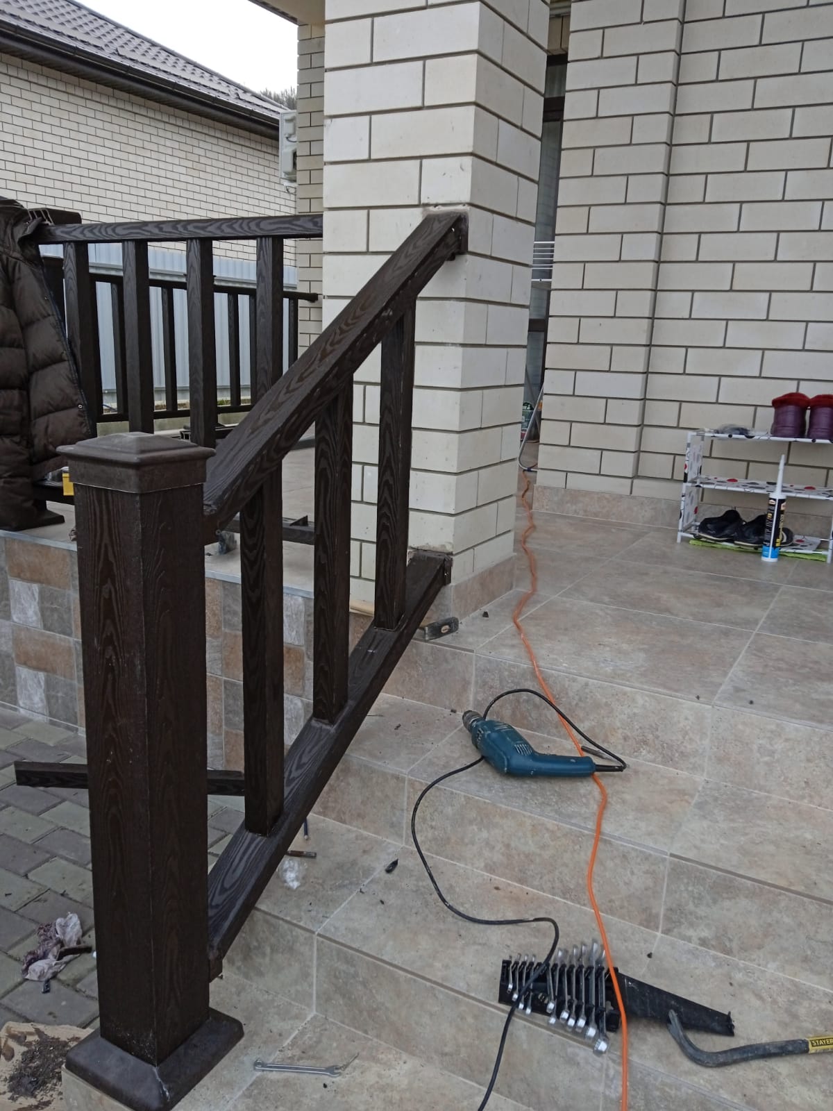 Произвели поставку и шеф-монтаж ограждения из ДПК NauticPrime (венге) на открытой площадке входной группы частного дома и перила для ступеней.